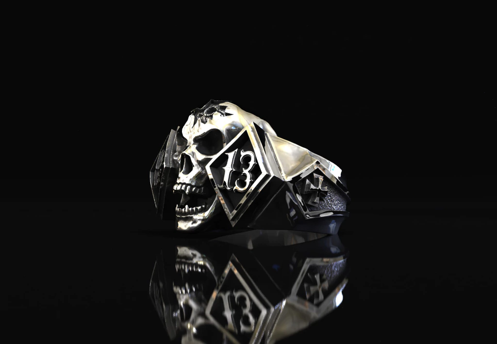Uma peça robusta, forjada em prata lei, este anel biker carrega a essência da ousadia e da irmandade. No centro, um crânio encara com firmeza, símbolo atemporal da coragem e da aceitação da vida na estrada, sempre à beira do perigo. De um lado, o diamante 1% representa o espírito daqueles que vivem fora das convenções, orgulhosos de sua identidade fora da lei. Do outro, o diamante 13 traz consigo o peso da lealdade e da resiliência, número há muito associado aos códigos ocultos da cultura motociclista. As laterais do anel são marcadas com imponentes cruzes de ferro, evocando força, honra e individualidade. Mais que um acessório, esta peça é uma declaração — bruta, destemida e inegavelmente fiel à estrada.