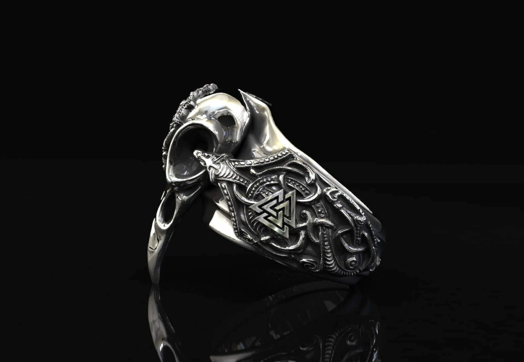 Este poderoso anel traz a essência do hrafn — o corvo, sagrado na tradição nórdica como mensageiro de Odin e símbolo de sabedoria, visão e dos mistérios do desconhecido. Forjado em prata lei, a peça apresenta uma caveira de corvo ricamente esculpida, adornada na testa com ornamentos que retratam o próprio Odin ladeado por dragões vikings, guardiões de força e proteção. Nas laterais, o anel possui ornamentos intrincados em forma de escudos, representando bravura e o espírito guerreiro. Cada detalhe foi concebido com rigor histórico, ecoando a arte e a maestria da era viking. Um verdadeiro talismã de conhecimento, proteção e estilo ousado.