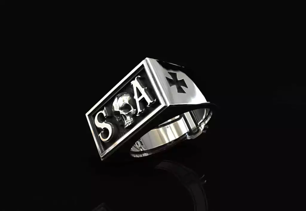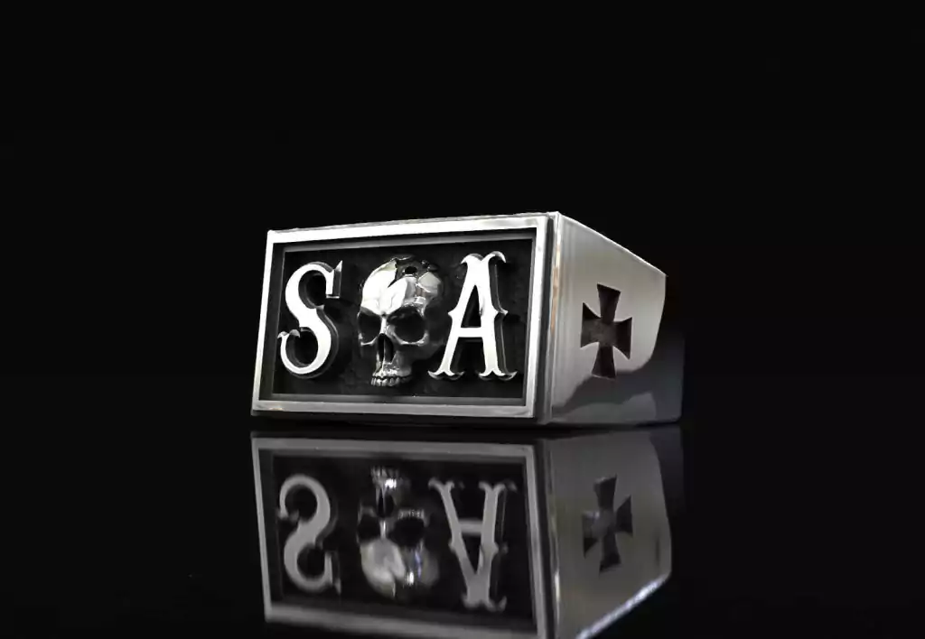 Um anel inspirado na série Sons of Anarchy. Simboliza rebeldia, lealdade e a liberdade nua e crua da estrada aberta. A cruz de ferro nas laterais representa força e desafio, enquanto as linhas retas dão um design ousado e direto. Na sigla "S.O.A", uma Caveira substitui a letra "O", reflete os riscos e impermanência que vêm com a lealdade à irmandade, capturando o espírito dos fora-da-lei que vivem sob suas próprias regras. Este anel é mais do que uma joia—é uma declaração de independência destemida e de compromisso com o estilo de vida biker.